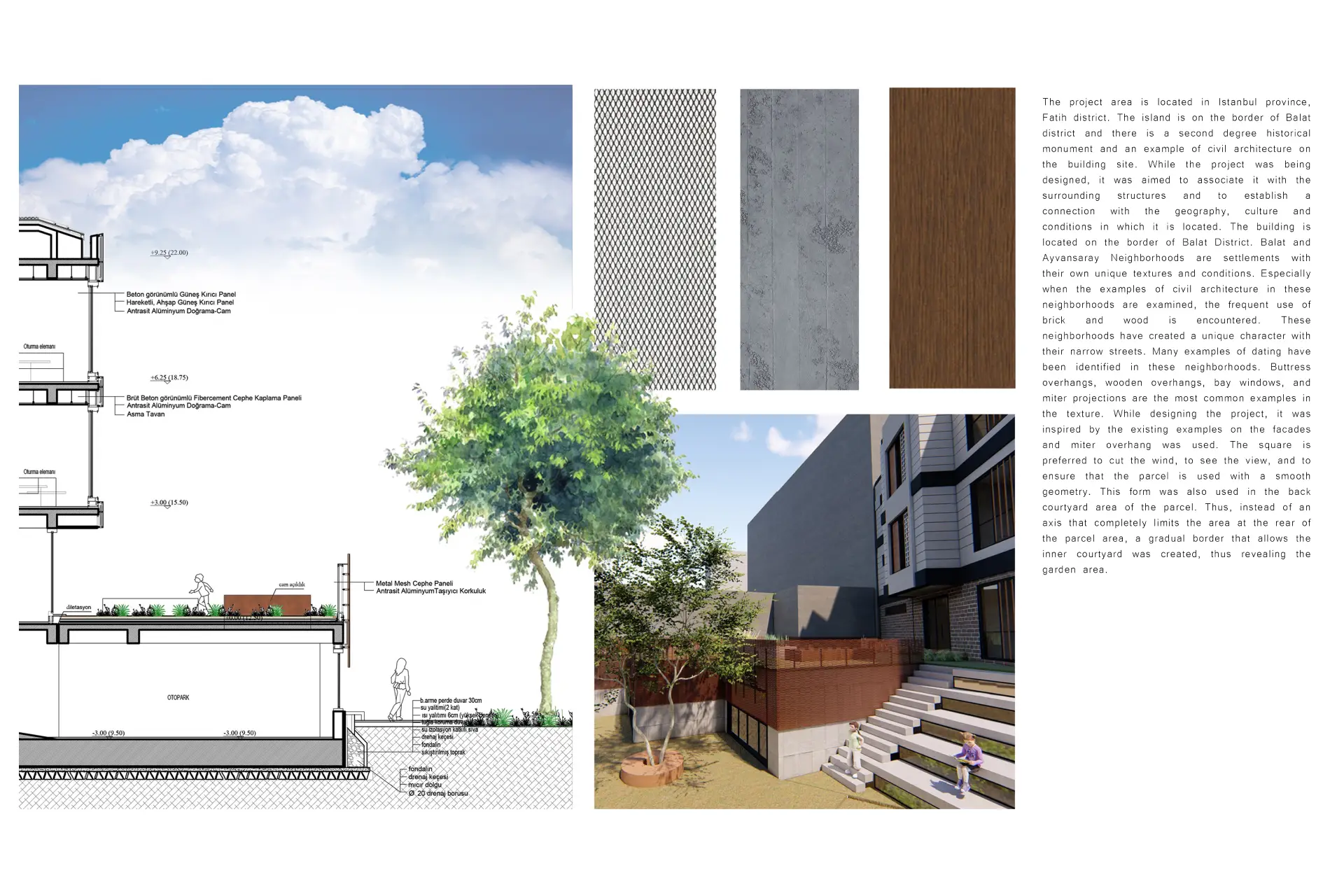 Proje alanı İstanbul ili, Fatih ilçesi sınırlarında yer almakta olup Balat semti sınırında bulunmaktadır ve yapı ikinci derece tarihi eser statüsünde, sivil mimarlık örneğidir. Proje tasarlanırken, çevredeki yapılarla ilişki kurmak ve bulunduğu bağlama uyum sağlamak hedeflenmiştir. Yapı, Balat ilçesi sınırında konumlanmaktadır. Balat ve Ayvansaray mahalleleri kendine özgü dokuları ve koşullarıyla yerleşimlerdir. Özellikle bu mahallelerdeki sivil mimari örnekleri incelendiğinde tuğla ve ahşap kullanımının sıkça görüldüğü fark edilir. Bu mahalleler, dar sokaklarıyla kendine has bir karakter oluşturmuştur. Bu mahallelerde farklı dönemlere ait pek çok örnek tespit edilmiştir. Payanda çıkmaları, bay pencereler ve cumbalar cephede en sık karşılaşılan unsurlar arasında yer almaktadır. Proje tasarlanırken mevcut örneklerden esinlenilmiş; cephelerde sıva ve metal kaplama tercih edilmiştir. Manzarayı kesmemek ve parselin akıcı bir geometriyle kullanılmasını sağlamak amacıyla kare kesitli kütle tercih edilmiştir. Bu form aynı zamanda parselin arka bahçesini de kullanıma açmıştır. Böylece parsel alanını tamamen kapatan bir aks yerine, iç avluya geçişi sağlayan kademeli bir sınır oluşturulmuş ve bahçe alanı ortaya çıkarılmıştır.